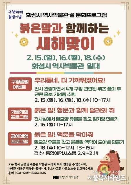 서울복지타임즈 이재연 기자 | 화성특례시는 설 연휴 기간인 오는 2월 15일부터 18일까지 화성시 역사박물관에서 ‘붉은 말과 함께하는 새해맞이’ 설날 문화프로그램을 운영한다.