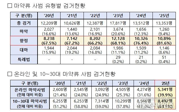 신종 마약류의 대다수에 해당하는 향정신성의약품은 검거 인원이 ’24년 10,326명(76.4%)에서 ’25년 10,896명(81.6%)으로 증가, 압수량은 ’24년 381kg에서 ’25년 448kg으로 증가했으며, 최근 급성장한 온라인 마약 유통시장을 통해 젊은 연령층으로 빠르게 확산하고 있다.