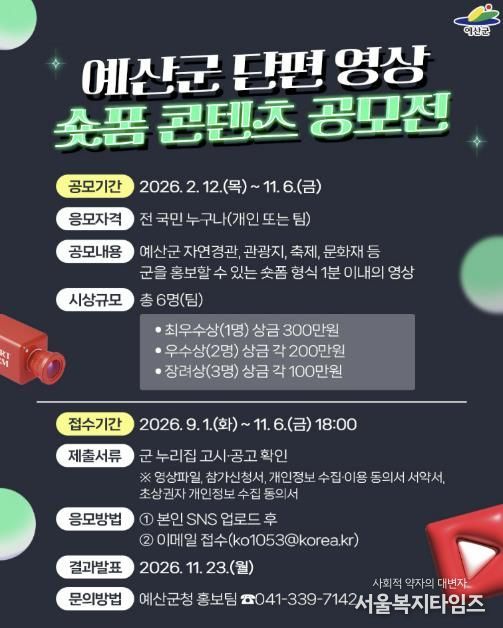 서울복지타임즈 이재연 기자 | 예산군은 지역의 숨은 매력을 담은 단편 영상(숏폼) 콘텐츠 발굴을 위해 ‘예산군 숏폼 콘텐츠 공모전’을 개최한다고 12일 밝혔다.