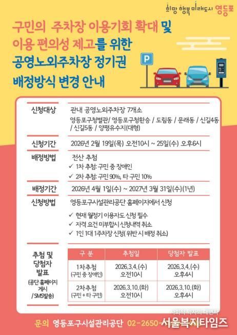 서울복지타임즈 이재연 기자 | 영등포구가 관내 공영노외주차장 7개소에 대한 정기권 신청을 ‘선착순 순환배정제’에서 ‘구민 우선 전산추첨 순환배정제’로 변경해 오는 19일부터 25일까지 접수한다고 밝혔다.
