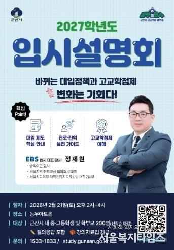 서울복지타임즈 이재연 기자 | 군산시가 변화하는 대입 정책과 고교학점제에 대한 학생·학부모의 이해를 돕기 위해 21일 오후 2시 동우아트홀에서 ‘2027학년도 입시설명회’를 개최한다.