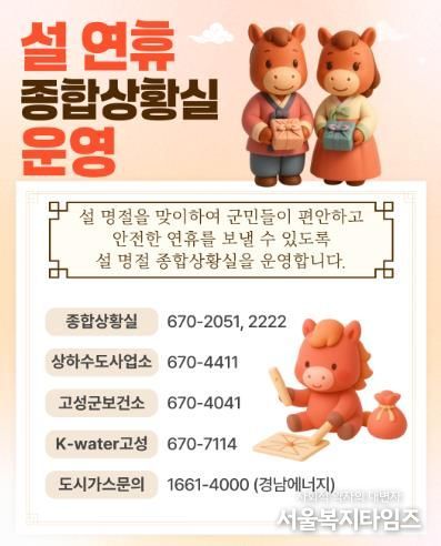 서울복지타임즈 이재연 기자 | 고성군이 설 명절 종합대책을 가동하며 본격적인 명절맞이에 돌입한다고 밝혔다.