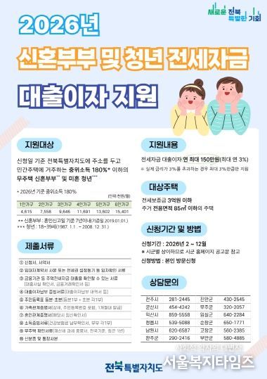 서울복지타임즈 이재연 기자 | 전북특별자치도는 도민들의 주거비 부담을 완화하고 안정적인 정착을 지원하기 위해 저소득층 대상 임대보증금 무이자 융자, 신혼부부와 청년을 위한 전세자금 대출이자 지원, 공공임대주택 보증금 지원 등 '주거비 지원 3종 세트'를 올해부터 대폭 확대 시행한다고 12일 밝혔다.