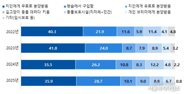 반려동물 입양경로는 지인을 통한 분양(유료·무료)이 46.0%로 가장 많았고, 펫숍에서 구입함(28.7%), 길고양이 등을 데려다 키움(9.0%) 순으로 나타났다.
