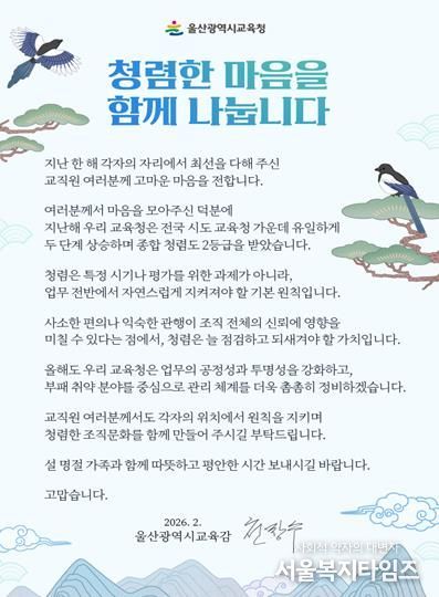 서울복지타임즈 이재연 기자 | 울산광역시교육청은 설 명절을 앞둔 12일 울산 지역 전 교육기관과 학교 교직원에게 청렴 의지를 다지는 ‘청렴 서한문’을 보냈다.