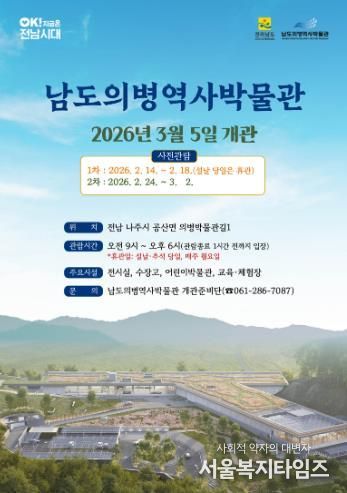 서울복지타임즈 이재연 기자 | 전라남도는 오는 3월 5일 개관하는 남도의병역사박물관을 설 연휴 등 두 차례 시범운영으로 사전 공개해 전시·시설 전반을 최종 점검하고 관람객 의견을 반영함으로써 ‘의(義) 교육 허브’로서의 완성도를 높일 계획이다.