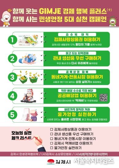 캠페인에서 제시된 주요 실천 항목은 ▲ 김제사랑상품권 이용하기 ▲ 관내 생산품 우선 구매하기 ▲ 동네가게·전통시장 이용하기 ▲ 공공배달앱 '먹깨비' 이용하기 ▲ 물가안정 실천하기 등으로, 지역 내 소비가 지역경제로 다시 환원되는 선순환 구조에 초점을 맞췄다.
