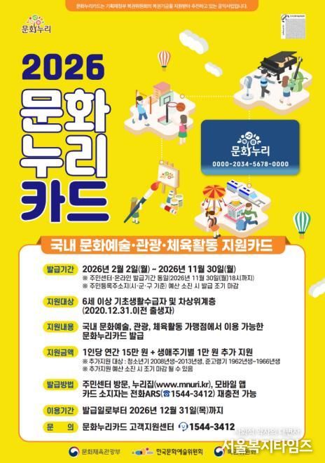 서울복지타임즈 이재연 기자 | 서울 강동구는 문화 향유 기회 확대를 위해 기초생활수급자와 차상위계층을 대상으로 2026년 문화누리카드(통합문화이용권) 사업을 추진한다고 20일 밝혔다.