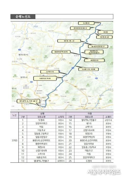 서울복지타임즈 이재연 기자 | 포천시는 오는 3월 4일부터 경기도 광역 공공버스 신규 노선인 3700번(도평리–별내역)을 정식 운행한다고 밝혔다.