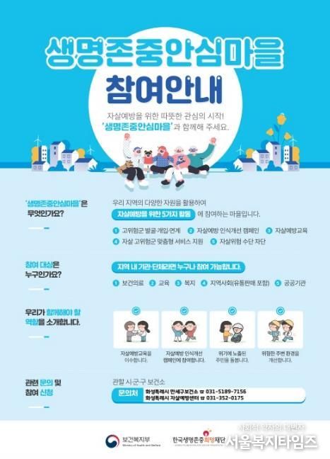 서울복지타임즈 이재연 기자 | 화성특례시가 자살 예방과 정신건강 증진을 위해 ‘생명존중 안심마을’을 확대 운영하고 사업에 함께할 지역사회 기관·단체를 모집한다고 밝혔다.
