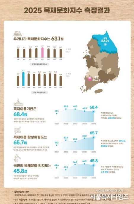 서울복지타임즈 이재연 기자 | 산림청은 전국 17개 광역시·도를 대상으로 목재문화 정착 및 진흥 수준을 평가한 ‘2025년 목재문화지수’ 결과를 30일 발표했다. 이 지수는 지역별 목재이용기반구축, 활성화, 목재문화 인지도 세 지표를 종합 평가한다.