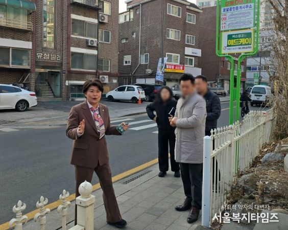 서울복지타임즈 이재연 기자 | 강북구의회 김명희 의장(번1·2동, 수유2·3동)은 지난 2월 20일, 번2동 오현로31길 일대 버스정류장 관련 민원 현장을 찾아 주민 불편 사항을 직접 확인했다. 이날 현장에는 강북구청 김석용 교통행정과장과 신하형 도로관리과장, 번동5단지 관리소 관계자가 함께 참석해 현황을 공유하고 개선 방향을 논의했다.