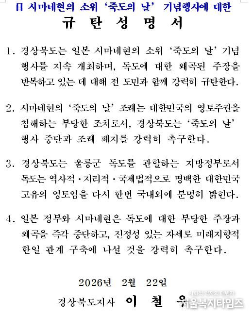 서울복지타임즈 이재연 기자 | 경상북도는 22일, 일본 시마네현이 소위 ‘죽도의 날’ 행사 개최에 대해 강력히 규탄하며, 행사 즉각 중단과 관련 조례 폐지를 촉구했다.