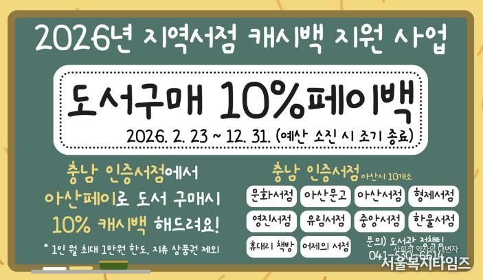 서울복지타임즈 이재연 기자 | 아산시는 지역 서점 활성화와 시민 독서환경 조성을 위해 오는 23일부터 “2026년 충남 인증 서점 도서 구매 캐시백 지원” 사업을 본격 시행한다.