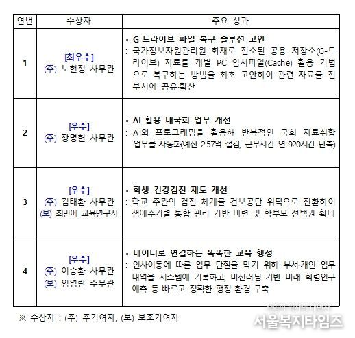 ‘최우수’는 노현정 사무관이 수상하며 500만 원의 포상금을 받았다. 작년 국가정보자원관리원 화재 당시, 전 부처의 공용 저장소(G-드라이브)의 자료가 사라질 위기에 처했다. 이에 노사무관은 전산직이 아님에도 해결법을 고민하여, 개별 컴퓨터에 남아 있는 임시 저장파일(Cache)로 자료를 복구하는 방법을 최초로 만들어냈다. 이 방법은 전 부처에 공유되어 행정안전부, 인사혁신처 등 자료 손실로 피해가 컸던 부처에서 자료를 되살리는 데 중요한 역할을 했다.