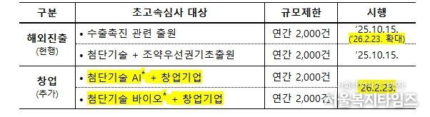 기존 제도는 구체적인 수출 실적을 요구하여 창업 초기 기업이 활용하는데 제약이 있었다. 이에 수출실적이 없는 창업 초기 기업도 중소벤처기업부의 해외진출 창업기업 지원사업에 참여했다면 초고속심사를 받을 수 있도록 확대했다. 이를 통해 해외진출을 추진 중인 창업 초기 기업도 초고속심사를 보다 용이하게 이용할 수 있을 것으로 기대된다.
