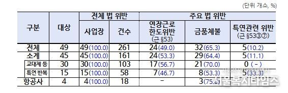 감독 결과, 45개소 전 사업장에서 총 243건의 근로기준·산업안전 분야 법 위반 사항이 적발됐다. 주요 위반 내용으로는 ▴연장근로 한도 위반 24개소(53.3%), ▴연장·야간·휴일근로수당 등 금품체불 29개소(64.4%, 약 22억 3천만원), ▴특별연장근로 인가 시간 미준수 등 5개소(11.1%), ▴보건․건강관리 조치 미이행 24개소(53.3%), ▴안전보건 교육·관리 체계 미이행 29개소(64.4%) 등이 확인됐다.