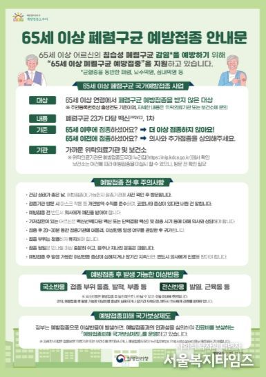 서울복지타임즈 이재연 기자 | 영주시보건소는 65세 이상 시민을 대상으로 폐렴구균 무료 예방접종을 연중 실시하고 있다며, 대상 어르신들의 적극적인 접종 참여를 당부했다.