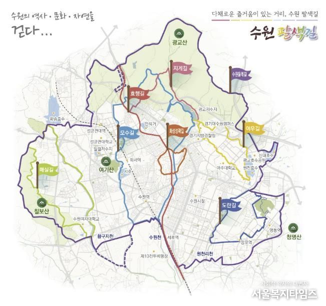 서울복지타임즈 이재연 기자 | 수원특례시는 수원 전역 수원팔색길 구간에서 도시개발로 단절된 노선을 복원하고 노후 이정표와 시설물을 교체하는 ‘수원팔색길 종합정비’를 5월까지 추진한다.