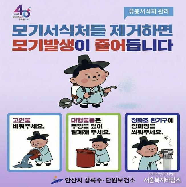 이미경 상록수보건소장은 “모기 서식처를 사전에 제거하면 발생을 크게 줄일 수 있다”며 “보건소의 철저한 방역에 시민들의 적극적인 협조가 더해진다면 더욱 쾌적하고 건강한 안산시를 만들 수 있을 것”이라고 말했다.