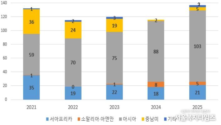 서울복지타임즈 이재연 기자 | 해양수산부는 2월 25일 ‘2025년 전 세계 해적사건 발생 동향’을 발표했다. 2025년 전 세계 해적사건은 2024년보다 증가(116→137건)했으나 승선자 피해는 감소(151→88명)했으며, 우리 국민과 선박에 대한 피해는 발생하지 않았다.