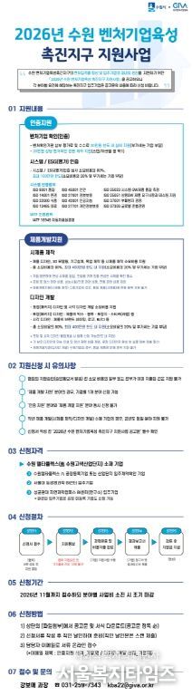 서울복지타임즈 이재연 기자 | 수원특례시가 수원 벤처기업육성촉진지구 내 중소·벤처기업을 대상으로 인증과 제품 개발을 지원하는 ‘2026년 수원 벤처기업육성촉진지구 활성화사업’에 참여할 기업을 모집한다.