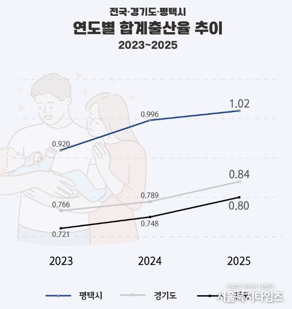 국가데이터처가 발표한 2025년 잠정 합계출산율에 따르면 평택시는 2024년 0.996에서 2025년 1.02로 상승하며 다시 1.0명을 넘어섰다. 2023년(0.92) 이후 2년 연속 상승이다.