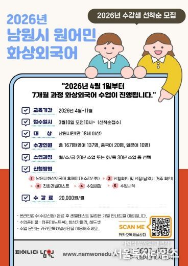서울복지타임즈 이재연 기자 | 남원시가 시민들의 어학 실력 향상과 글로벌 역량 강화를 위해 오는 3월 10일부터 ‘2026년 원어민 1:1 화상외국어 교육’ 수강생을 선착순으로 모집한다.