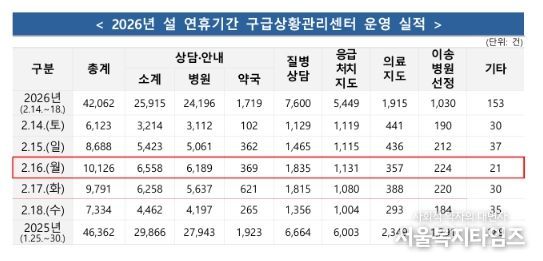 서울복지타임즈 이재연 기자 | 소방청은 2026년 설 연휴 기간(2.14.~2.18., 5일간)전국 총 45,082건의 구급 출동으로 24,166명을 이송하였으며, 구급상황관리센터에서 총 42,062건의 상담을 실시했다고 밝혔다.