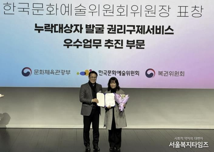 서울복지타임즈 이재연 기자 | 군포시 수리동이 전국 3천6백여개 읍면동을 대상으로 한 “2025년 통합문화이용권(문화누리카드) 누락대상자 권리구제 서비스” 부문 우수기관으로 선정됐다. 이에 따라 지난 2월 26일 모두예술극장(서울 서대문구 충정로 7)에서 열린 시상식에서 한국문화예술위원회 위원장상을 수상했다.