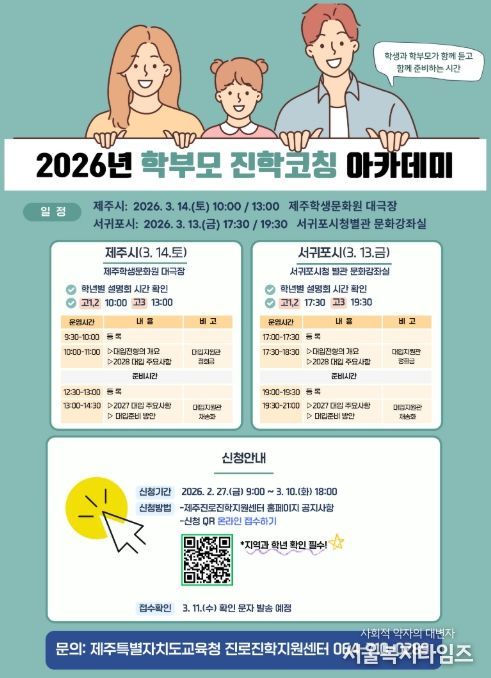 서울복지타임즈 이재연 기자 | 제주특별자치도교육청은 대입 정보 제공을 위한 ‘2026년 학부모 진학코칭 아카데미’를 3월 13일 서귀포시청 문화강좌실과 14일 제주학생문화원에서 개최한다.