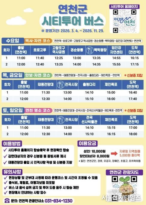 서울복지타임즈 이재연 기자 | 연천군이 오는 3월 4일부터 ‘2026년 연천 시티투어 버스’를 재운행한다. 운영 기간은 11월 29일까지다.