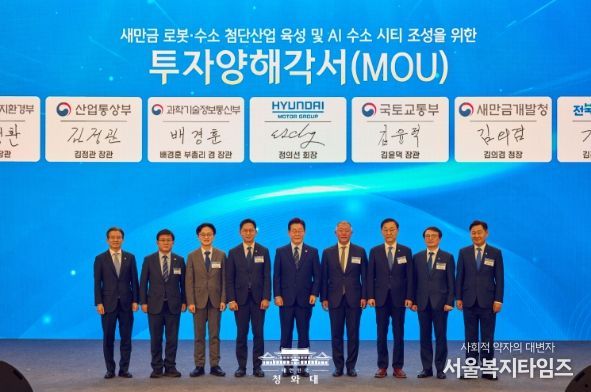 서울복지타임즈 이재연 기자 | 이재명 대통령은 27일 새만금 로봇·수소·AI 시티 투자 협약식에 참석해 "현대자동차그룹의 혁신 역량 그리고 풍부한 자원이 합쳐진다면 새만금은 최적의 시너지를 발휘하는 기회의 땅이 될 수 있을 것으로 믿는다"고 밝혔다.