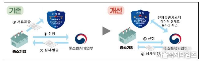 서울복지타임즈 이재연 기자 | 관세청은 수출입 중소기업의 행정 부담을 줄이기 위해 2월 27일(금)부터 세관의 중소기업확인 업무를 디지털 방식의 원스톱(One-Stop) 처리 서비스로 개편·시행한다고 밝혔다.