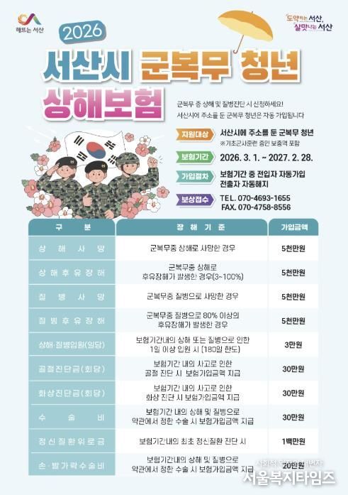 서울복지타임즈 이재연 기자 | 충남 서산시는 군 복무 청년 안전망 강화를 위해 군 복무 청년 상해보험을 시행 중이라고 밝혔다.