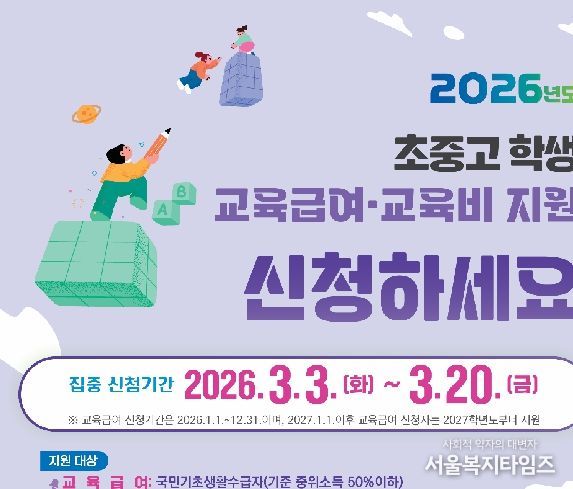 서울복지타임즈 이재연 기자 | 대전시교육청과 동·서부교육지원청은 3월 3일부터 3월 20일까지 저소득층 가정을 대상으로 ‘2026학년도 초·중·고 학생 교육급여 및 교육비 집중 신청 기간’을 운영한다고 밝혔다.