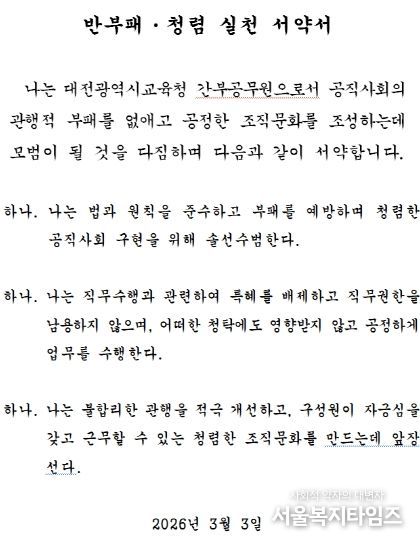서울복지타임즈 이재연 기자 | 대전시교육청은 3월 3일, 시교육청 6층 중회의실에서 고위직 공무원을 대상으로 투명하고 공정한 조직문화 조성을 위한 ‘청렴 실천 서약’을 실시했다고 밝혔다.