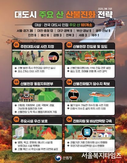 서울복지타임즈 이재연 기자 | 산림청은 대도시 인근 주요 산림에서 산불 발생 시 신속하고 체계적인 대응을 위해 ‘대도시 주요 산 산불진화 전략’을 2026년 2월말 기준으로 보완·현행화했다고 3일 밝혔다.
