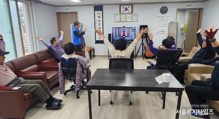 각 경로당에 모여 앉은 어르신들은 모니터 속 강사의 동작을 이리 저리 따라 하며 몸을 풀었다.