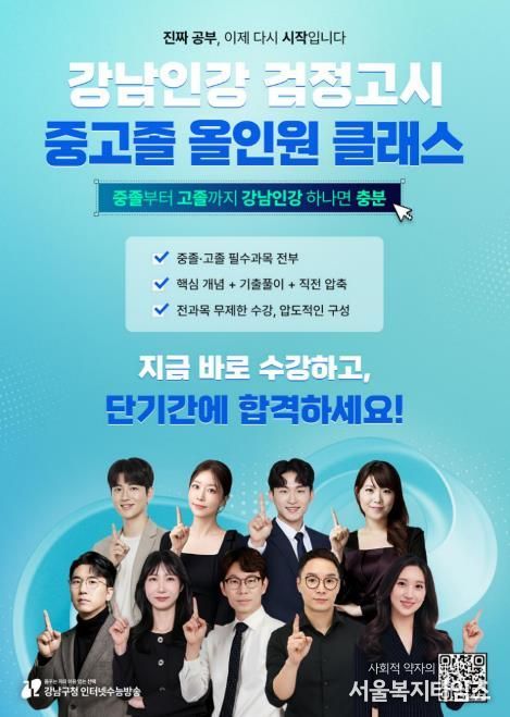 구는 교육 사각지대 해소를 위해 학교 밖 청소년에게 강남인강 연회비 5만 원을 전액 면제해 무료 수강을 지원한다. 일반 수험생도 연회비 5만 원으로 전 과목을 무제한 수강할 수 있어, 교육비 부담 없이 검정고시를 준비할 수 있도록 했다.