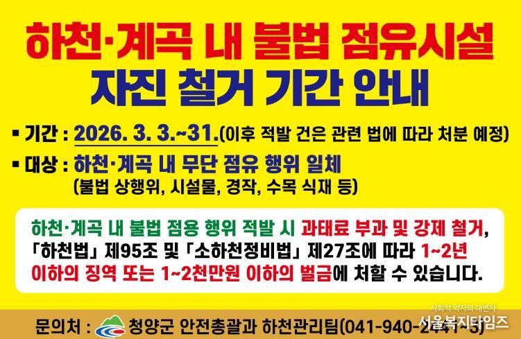 서울복지타임즈 이재연 기자 | 청양군이 하천의 공공 기능을 정상화하고 여름철 집중호우에 따른 재해를 사전에 방지하기 위해 3월부터 오는 9월까지 ‘하천 불법 점유 행위 일제 정비’를 추진한다고 밝혔다.