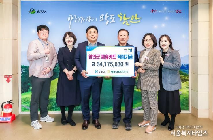 서울복지타임즈 이재연 기자 | 함안군은 지난 4일 엔에이치(NH)농협은행 함안군지부가 지난해 군청 직원과 보조금 지원 단체가 농협 제휴카드를 사용해 적립한 3417만 5000원을 함안군 복지 분야 기금으로 전달했다고 밝혔다.