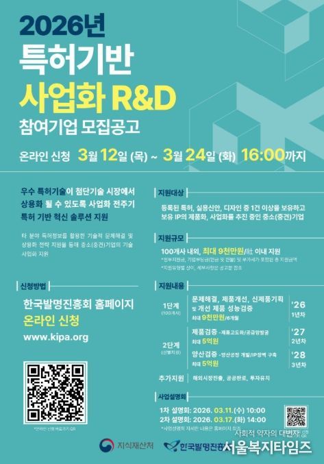 서울복지타임즈 이재연 기자 | 지식재산처는 3월 12일~3월 24일까지 중소·중견기업의 지식재산(지식재산) 기반 제품화 및 상용화를 전폭적으로 지원하는 ‘2026년 특허 기반 사업화 연구개발(지식재산-R&BD)’ 참여기업을 모집한다고 밝혔다.