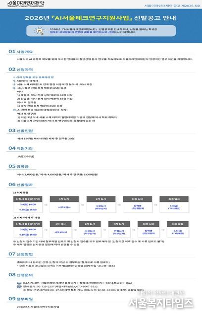 재단은 단순 재정 지원을 넘어 서울시 AI 정책과 연계한 프로그램을 운영하고, 연구성과 사사표기제 도입, 전문가 초청 강연, 박사후 연구원 워크숍 등 다양한 네트워킹 기회를 제공해 연구 역량 강화와 산·학·연 교류를 촉진할 예정이다.