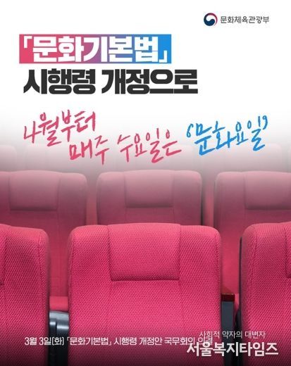 서울복지타임즈 이재연 기자 | 「문화기본법」 시행령 개정으로 4월부터 매주 수요일은 '문화요일'