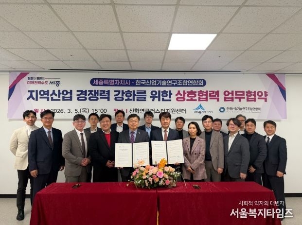 서울복지타임즈 이재연 기자 | 세종특별자치시가 5일 산학연클러스터지원센터에서 ㈔한국산업기술연구조합연합회(회장 김진우)와 지역산업 경쟁력 강화와 상호 협력을 위한 업무협약을 체결했다.