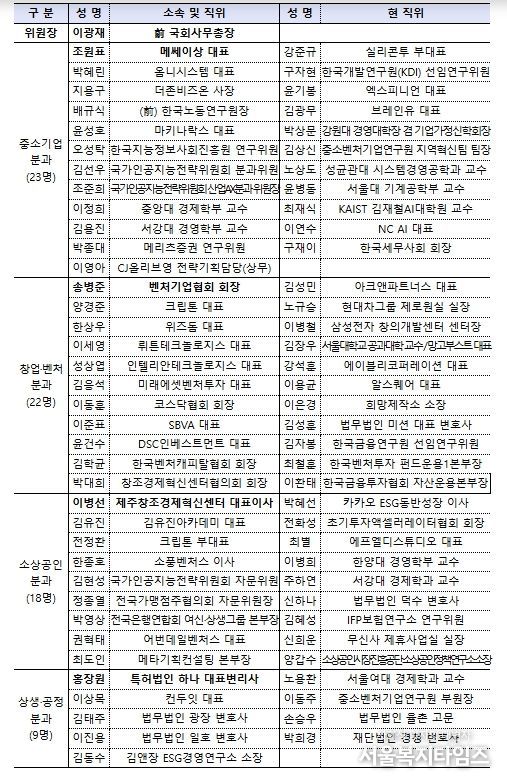 민관 정책협의회는 기업인, 민간 전문가, 학계, VC, 협·단체 등 총 72명의 위원으로 구성되어 출범일로부터 1년간 활동하게 된다. 또한 한성숙 중기부 장관과 이광재 전 국회사무총장이 공동위원장을 맡아 민관 정책협의회를 이끌어갈 예정이다.