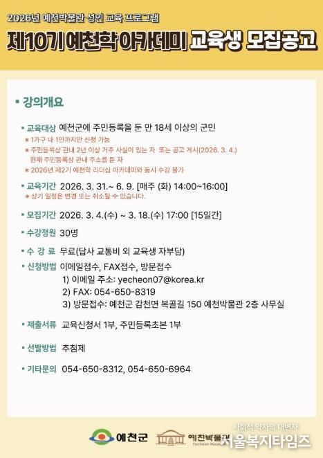 서울복지타임즈 이재연 기자 | 예천군은 2026년 상반기 ‘예천학 및 예천학 리더십 아카데미’ 교육생을 18일까지 모집한다.