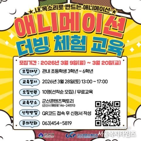서울복지타임즈 이재연 기자 | 전북 군산콘텐츠팩토리가 초등학생을 대상으로 ‘애니메이션 더빙 체험’ 교육을 3월 28일 운영하며, 참가자 10명을 선착순 모집한다.