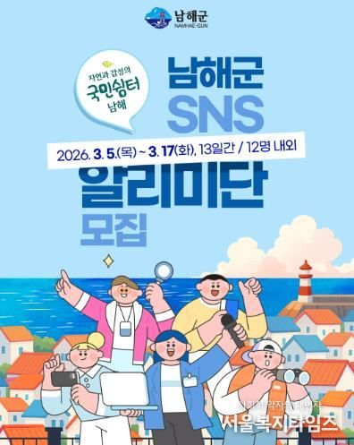 서울복지타임즈 이재연 기자 | 남해군이 ‘2026년 자연과 감성의 국민쉼터’ 남해의 다채로운 매력을 널리 전파할 ‘제9기 남해군 SNS 알리미단’을 오는 3월 5일부터 17일까지 13일간 모집한다.